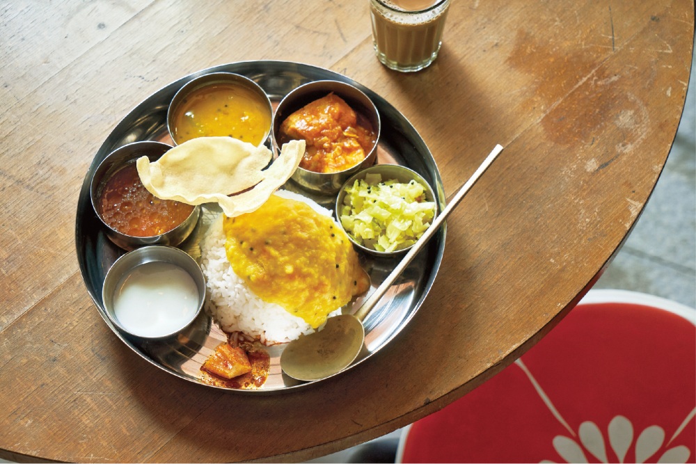 多治見駅から徒歩で約15分の「オリベストリート」にある、南インドカレーの店「タネヲマク」。かつてインドを訪れた際に食べた味を独学で模索したという、店主の増田さんが作るのは、数種類のカレーやおかず、ご飯を一皿に盛り付けた、現地流の定食プレート“ミールス”。ランチは、「VEG MEALS(ベジミールス)」(1000円)の1種類のみで、甘い・辛い・酸っぱい・苦いなど、様々な味わいが一皿に盛り込まれており、食べ応え満点!そこに日替わりの「NON VEG TOPPING」(300円)や、「ミニチャイ」(200円)などを、好みに合わせて注文できます。