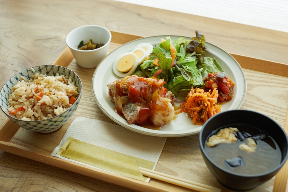 各務原ニンジンを生産する「フォレストファーム」は、土にこだわり、臭みが少なく甘みたっぷりのニンジンを作っています。そんな農園が「“ほかるもの”(捨てるもの)を消費して、フードロスを改善したい」という想いで、規格外野菜を用いたランチを提供しているのが「ホカルノコーヒー」です。ランチは、肉・魚、パスタ、カレーの4種類からメインが選べます。写真は、「気まぐれ魚ランチ 鮭の竜田南蛮あんかけ」(1280円)。魚・肉ランチに付くニンジンをたっぷりと使った炊き込みごはんは、その甘みを存分に感じられる一品です。