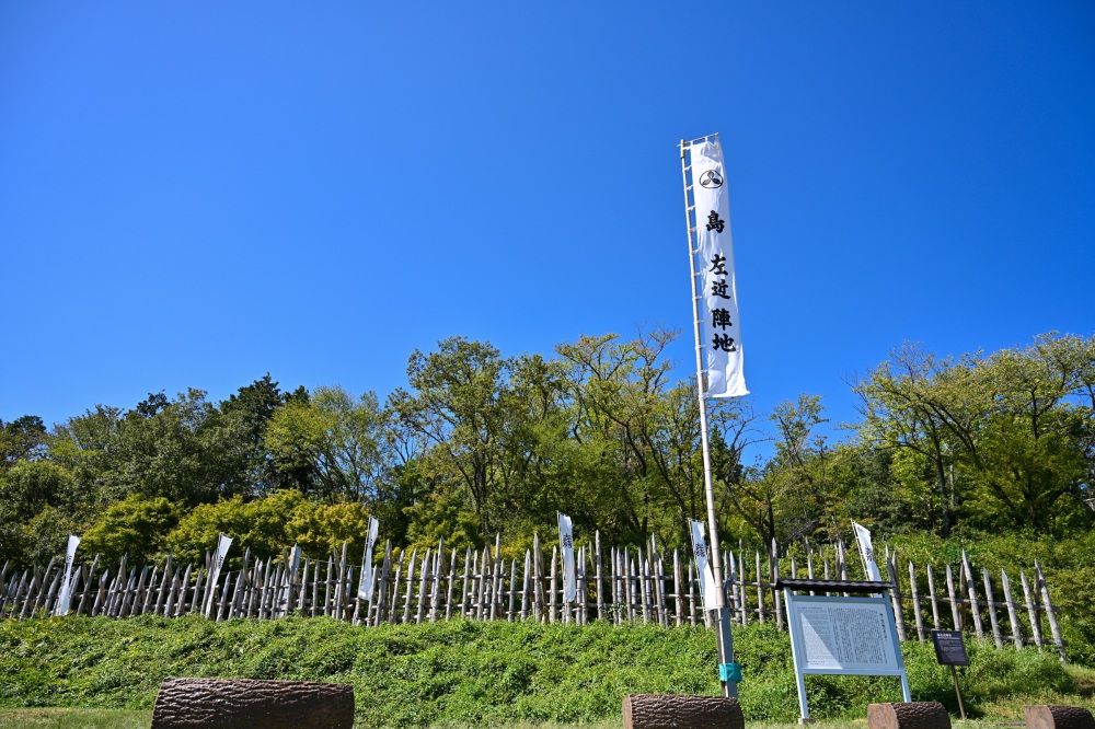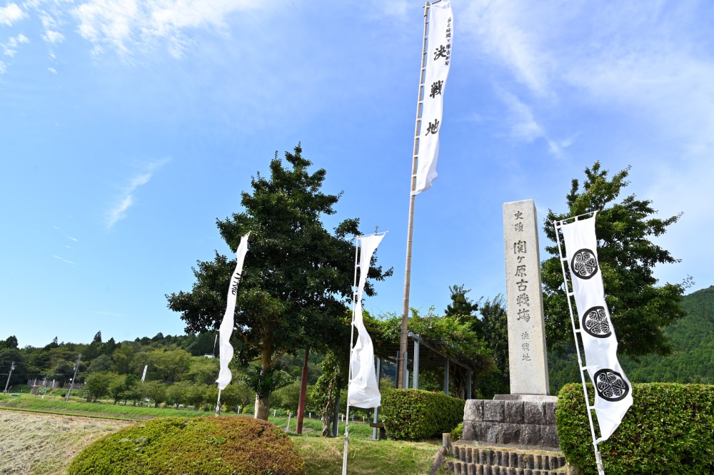 記念館から北西に続くなだらかな坂を上っていくと、風になびくのぼり旗と「決戦地」と刻まれた石碑が堂々と立っています。奥には石田三成や島左近が陣を敷いた笹尾山が見えます。
