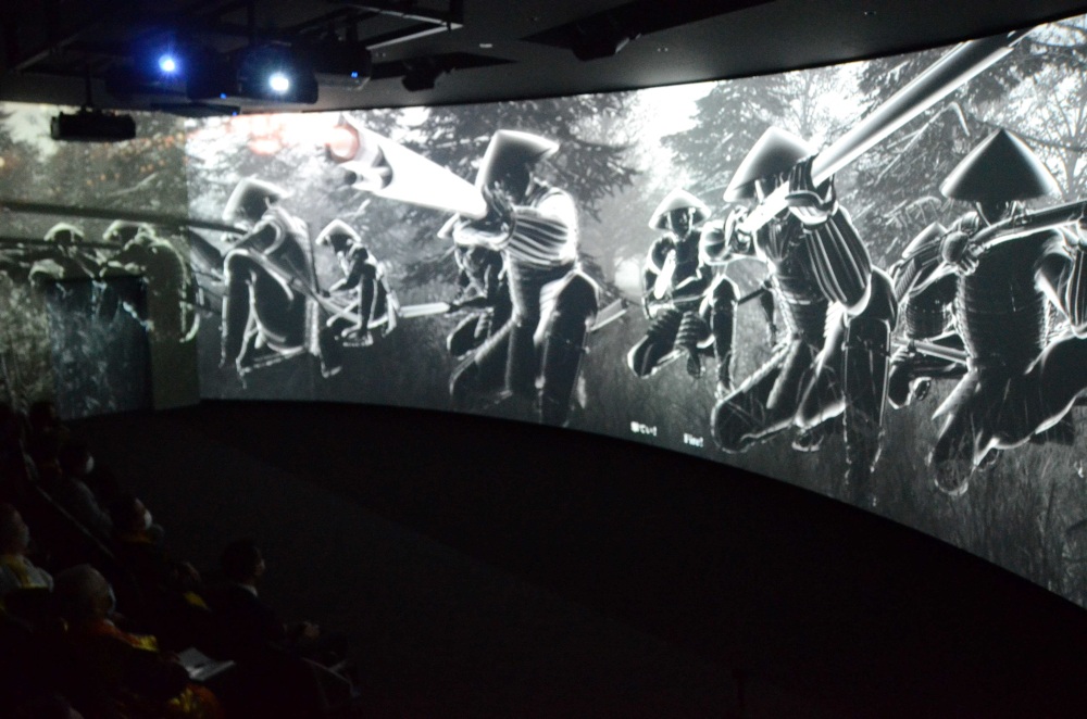 床面に設置された巨大なスクリーン「グラウンド・ビジョン」で、関ケ原の戦いまでに至る経緯や6時間にわたる東西両軍の戦況を一気に確認。奥の扉が開いた先で待ち構えるのは、縦4.5メートル、横13メートルの巨大曲面シアター。両軍の激突が武将たちの目線で描かれます。