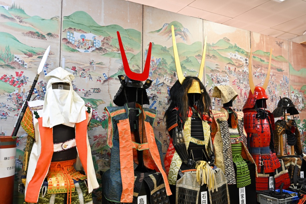 笹尾山のふもとにあるのが、甲冑体験のできる「笹尾山交流館」。甲冑には紙で作られた子ども用から足軽、名物武将の甲冑を模したプレミアム品までさまざま。中には重さ20キロ近いものもあるとか。