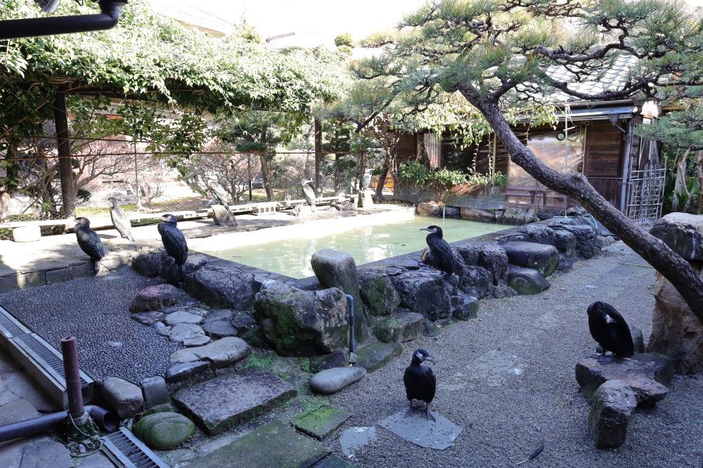 そう声を掛けられ、暖簾(のれん)をくぐって少し進むと、20羽近くの鵜が気ままに過ごしていました。見知らぬ人が入って来ても、特に驚く様子もありません。
