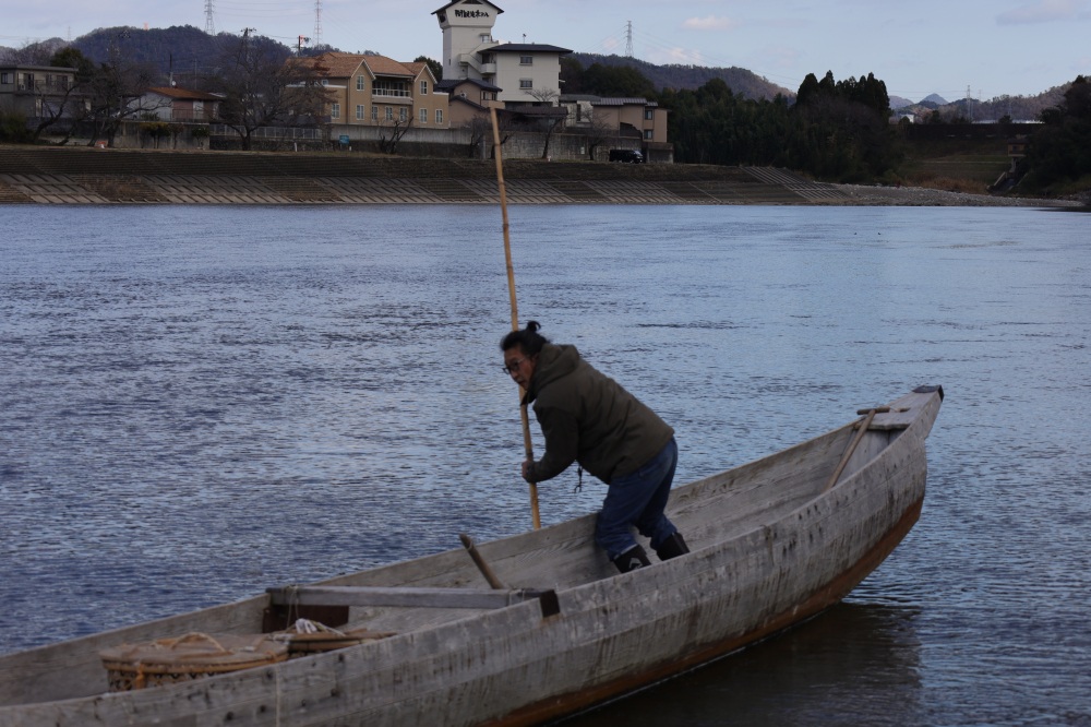 お隣に住む鵜匠代表の足立太一さんの庭先へお邪魔すると、やって来たばかりの一回り小さな4羽の鵜が元気に動いていました。陽一郎さんは太一さんと一緒に新しく仲間入りする鵜たちの様子を見た後、鵜たちを連れて川へ。舟へ乗り込むと、棹(さお)を使って力強く漕ぎ出していきました。
