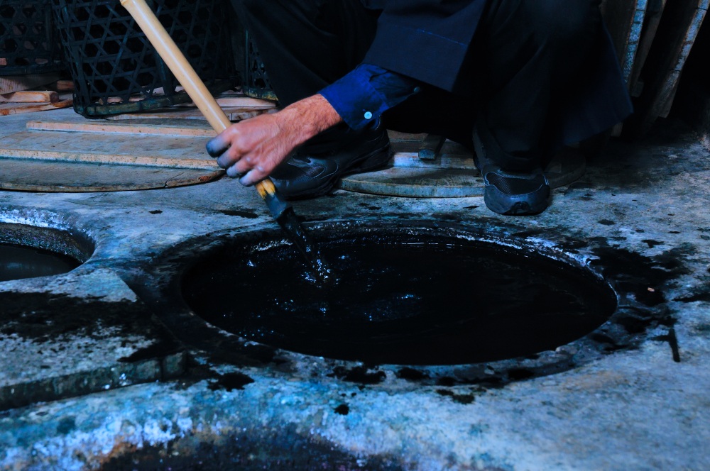何度も生地を甕に浸して空気に入れて晒し、最後に冷たい水に晒すことで「冴えた青」を生み出します。