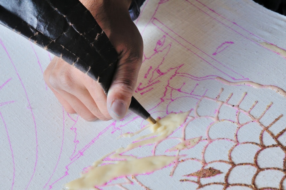郡上本染の図柄は、かまどで炊いたもち米から作った糊を、筒から少しずつ絞り出すように一点一点描きます。糊が乾燥した後、土間の地中に埋まっている藍草を発酵させた染め液の甕(かめ)に生地を何度も浸して濃紺まで染色。藍の発酵が染め色に影響するため、一吉さんは毎日、温度や湿度を調節しています。