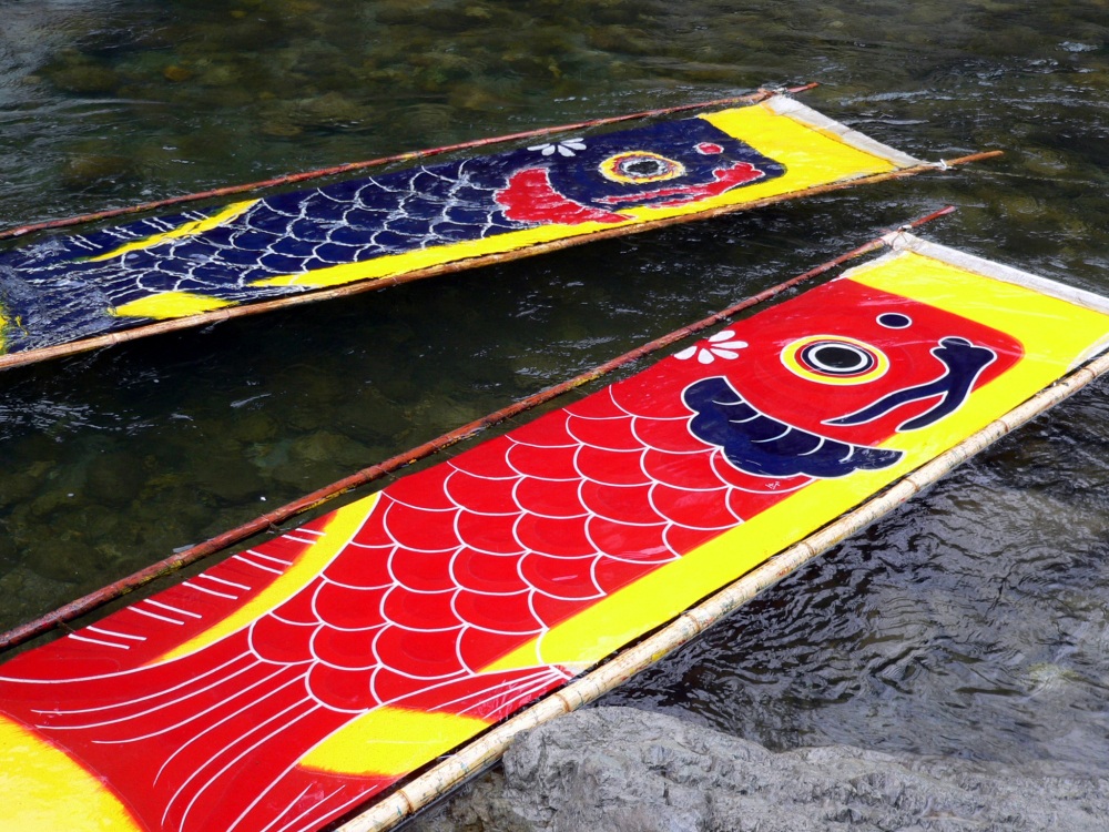毎年「大寒の日」に、郡上本染の「鯉のぼりの寒ざらし」が行われます。真冬の冷たい川に赤や黄色などで彩色された鮮やかな色のこいのぼりが川面を彩り、冬の風物詩として地元の人や観光客で賑わいます。