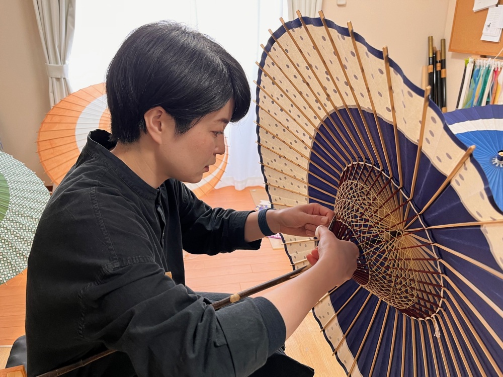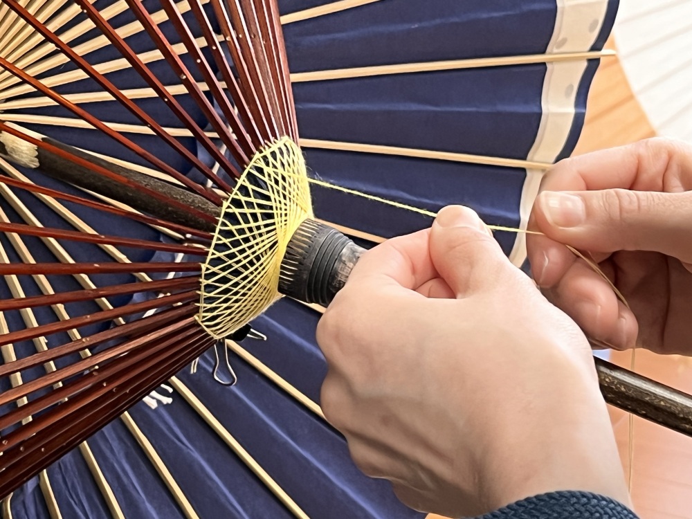 傘の骨を内側から支える精巧な骨組みに補強と装飾を兼ねて糸を通す「糸かがり」も、一本一本丁寧に力加減を調整しながら通していきます。「一人でほとんど全ての工程を手作業で行うのは大変さもありますが、前後の工程も自分がやっているので、品質をコントロールして全体的にバランスを整えやすいというメリットもあります」。