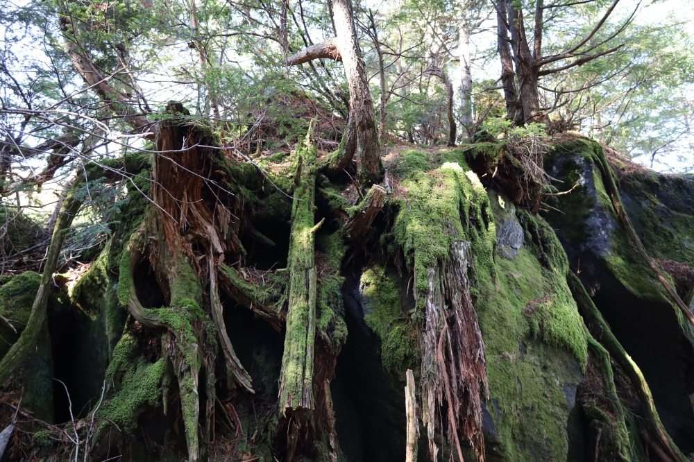 倒木の上で新しい木が成長するうちに、下にあった倒木は朽ちて空洞をつくり、森の土へと還っていきます。その生命の循環に、森が過ごしてきたとてつもなく長い月日を感じさせます。