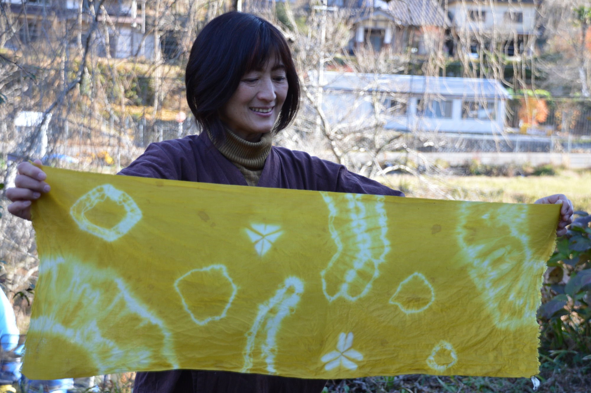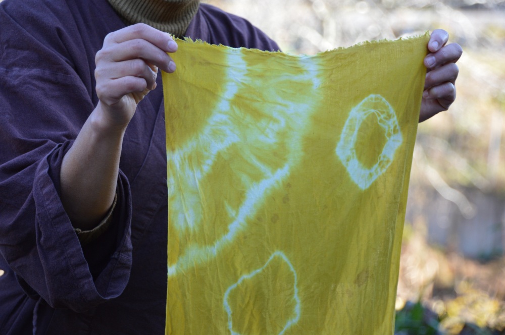 ヨモギで染めた布は、薄く淡い黄色に。ナツメグで染めた布は、鮮やかな山吹色になりました。