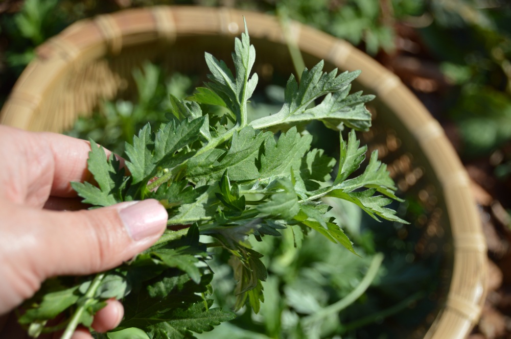 草木染の体験では、ヨモギとクチナシで手ぬぐいと手さげ袋を染めました。どちらも近所で採れた薬草です。ヨモギは根から抜かずに、葉だけを摘みます。手にはヨモギの青々とした香りがほのかに残り、爽やかな気持ちになります。