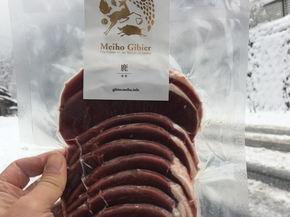冷凍したシカのもも肉を持ち帰り、フライパンで焼いて塩で食べてみました。肉質は柔らかく全く臭みがありません。コクと旨味が凝縮していて、噛むほどに滋味深い味わいが口に広がります。郡上の豊かな自然の恵みです。