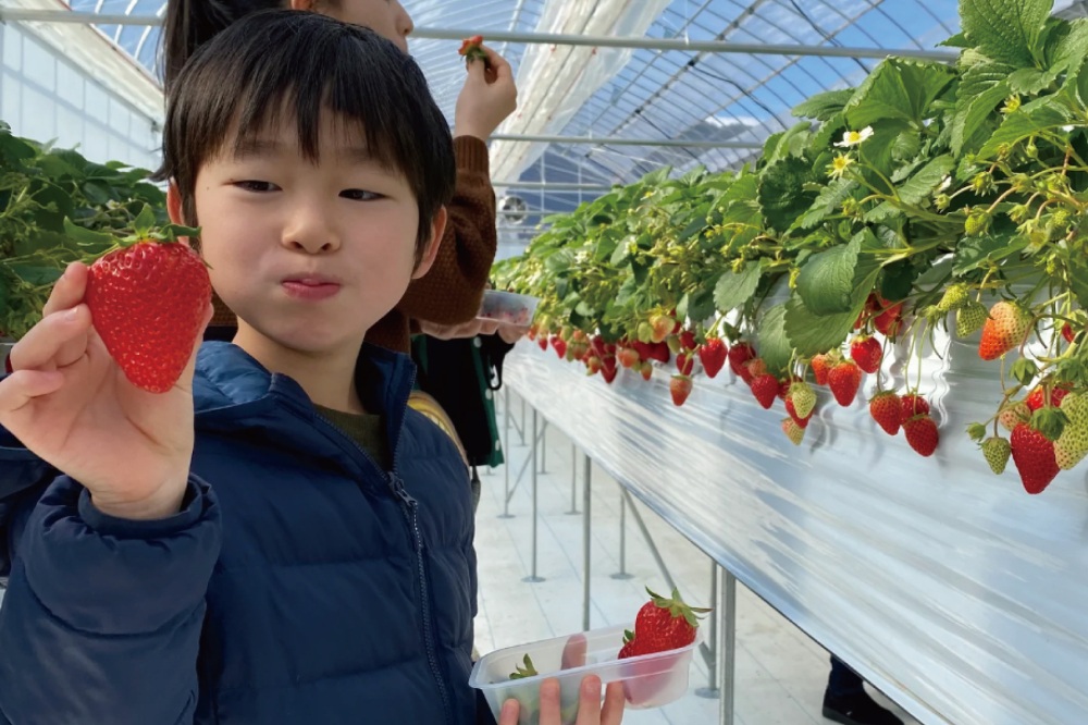 獲れたて農産物の直売所もある大きな農園でいちご摘み