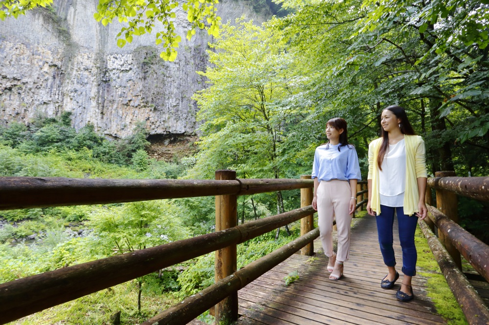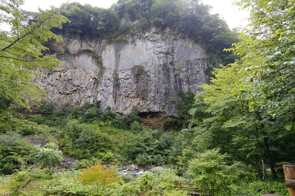 「小坂の滝めぐり」に入る森の入口には「巌立峡(がんだてきょう)」という約5万4千年前の噴火によってできた壮大な溶岩の絶壁が出迎えてくれます。