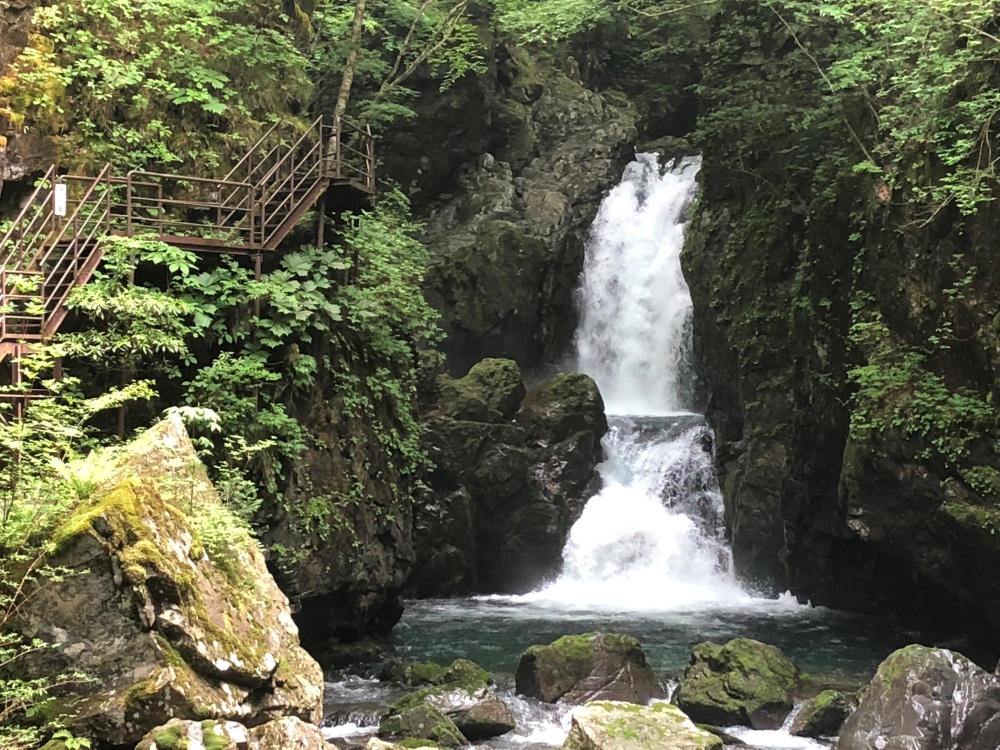 出会う滝の表情はさまざまで、ゴーゴーと音を立てて流れるパワフルな滝、スーッと滝つぼに吸い込まれていくような神秘的な滝、岩肌をサラサラと優しく流れる滝。滝つぼは翡翠(ひすい)色に輝き、場所によってその色を変えます。
