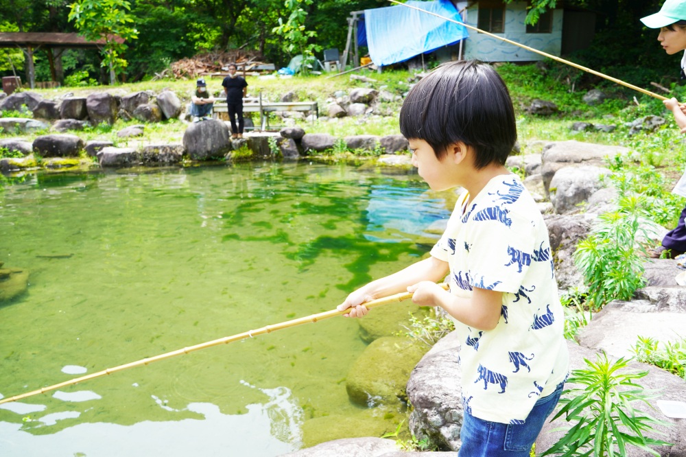 2020年、川をテーマにした新たな体験施設「小坂なリバーベース」が完成しました。「小坂な」は「お魚」に掛けていて、小坂淡水魚養殖漁業協同組合の敷地裏に建つ古民家が拠点です。この漁協では川から水を引いてイワナやアマゴ、ニジマスを養殖しています。成長しすぎて加工に向かなくなった魚などを、敷地内の釣り専用池に入れて、観光客はその池で釣りを楽しみ、釣った魚は漁協の加工場が捌いて塩焼きに。