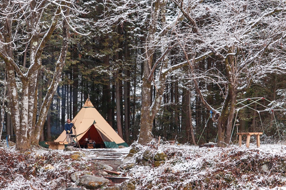古民家の裏手には透き通った川が流れ、庭先には小さな森に囲まれた1組限定のキャンプサイトが。養殖の魚を狙って飛んでくる野鳥のさえずりをBGMに、人と自然が共生する循環の楽しみ方を体験することができます。