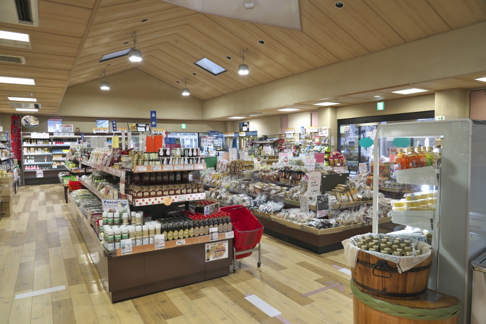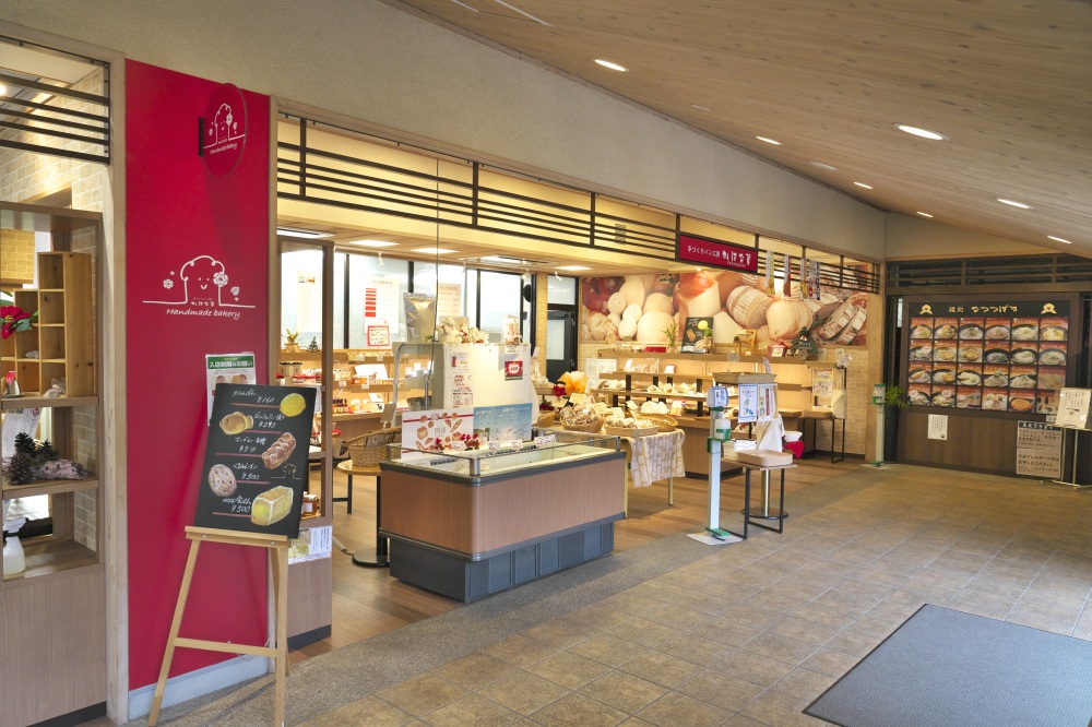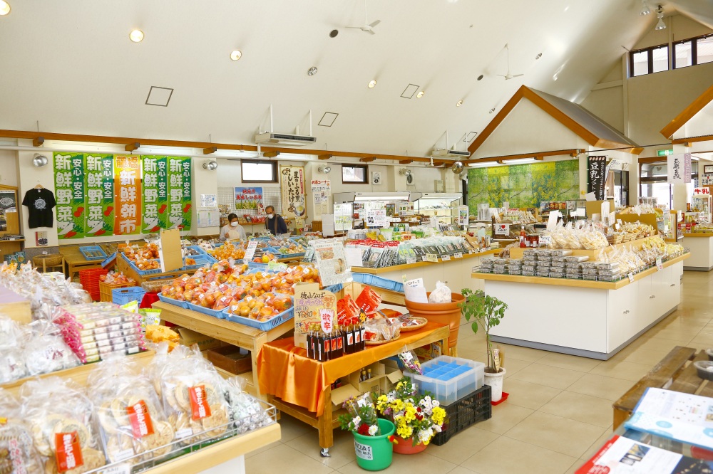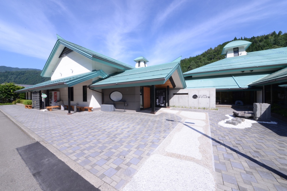 中庭広場を取り囲むように、物販店や手作りパン工房、飲食店が並び、足湯やアイスクリーム・ヨーグルト工房もあります。野菜の直売所である「郡上旬彩館やまとの朝市」や「やまと温泉 やすらぎ館」が隣接しています。