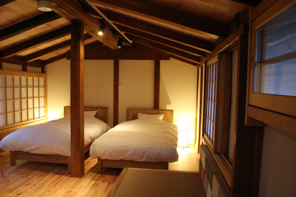 各部屋に置かれた家具も、地元の職人によるもの。これらはできる限り飛騨で採れた木で作られています。寝室に置かれたクッションカバーやベッドの装飾には、飛騨市河合の伝統工芸品「山中和紙」を使用しています。