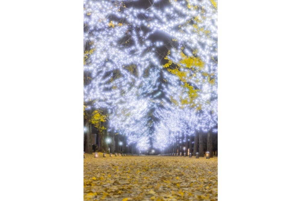 冬のはじめには一面に広がる落ち葉の絨毯が心地よく足元に感じます。約250メートルに渡る銀杏並木とイルミネーションはとても見応えがあります。