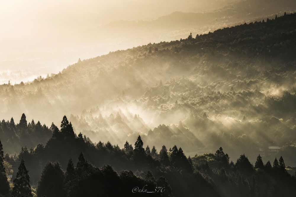 撮影者からひとこと:太陽が昇り、薄ら広がってきたもやに光が当たって光芒が出てくれました。