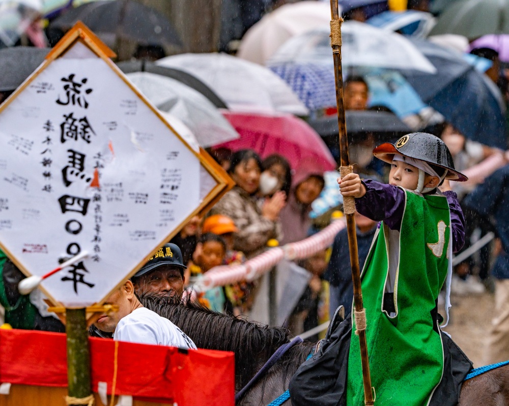 撮影者からひとこと:岐阜県土岐市にて流鏑馬があると聞いて、雨の中お祭りに参加しました。そこにはまだ息子より数歳年が上の子たちが、陣笠陣羽織で馬に跨り駆け上がる。馬上からの弓取儀式。若者の歴史を紡ぐ姿に胸をうたれました。