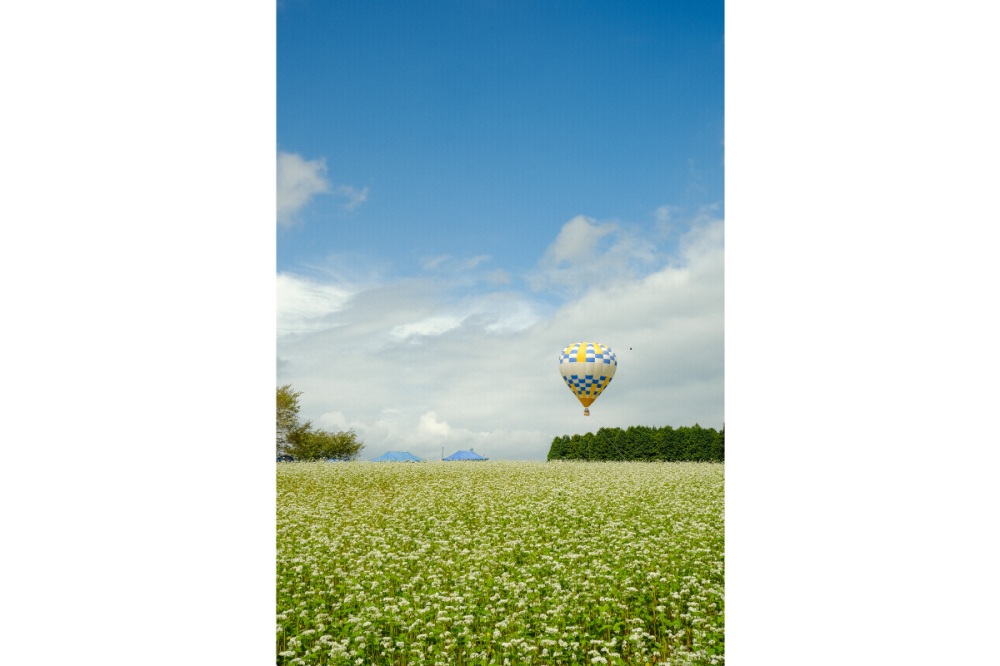 撮影者からひとこと:椛の湖そばの花まつり。真っ白な広大なそばの花の上を熱気球が青空を舞う。コントラストがとても綺麗で美しい景色でした。熱気球の上からはそばの花を見下ろすこともでき恵那山とともに楽しめました。