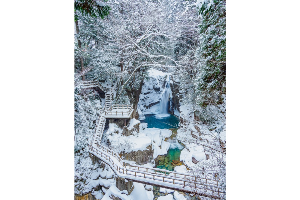 撮影者からひとこと:白い龍が棲むと言われている夕森公園 竜神の滝、雪の瀑布は正に白竜でした。美しいコバルトブルーの滝壺、降りしきる雪の中で目の前の絶景に寒さを忘れて撮影していました♪