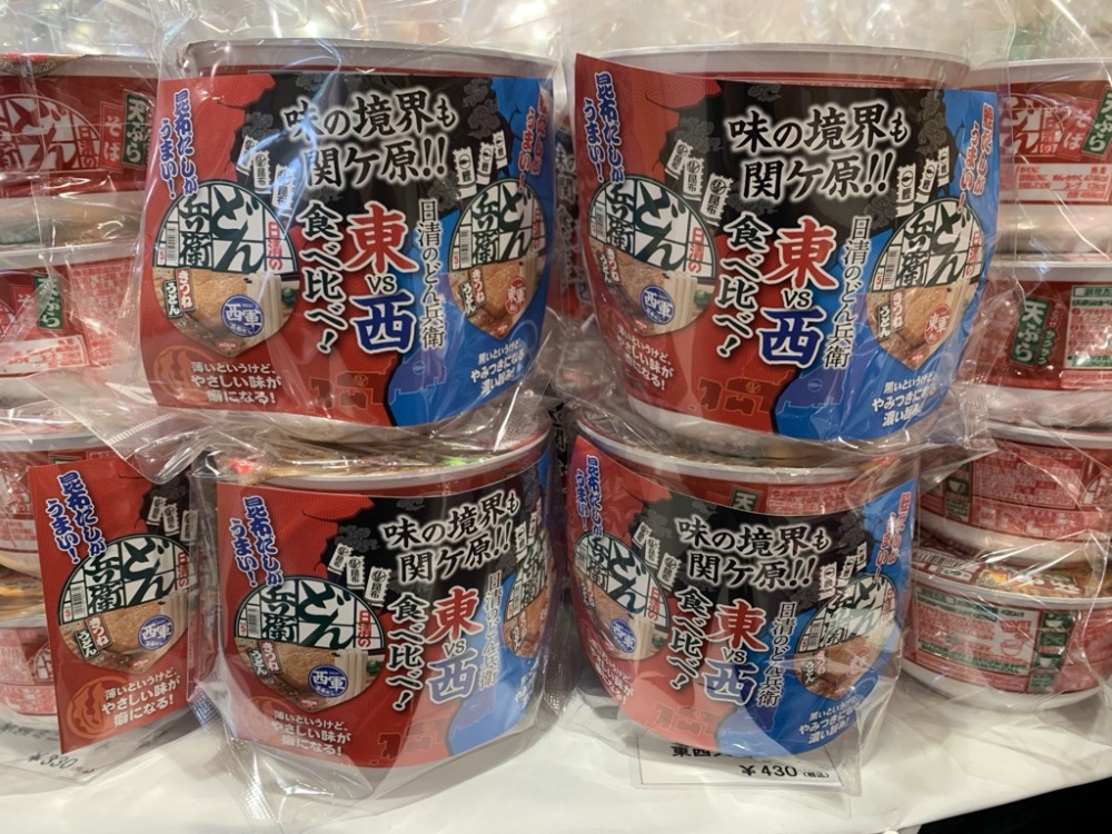 関ケ原町のオススメのお土産は「どん兵衛の東西セット」です。この商品は、東西のだしの境界線と言われている関ケ原にて、関東の鰹節だしと関西の昆布だしの2種類の食べ比べができるどん兵衛のセットとなっており、関ヶ原駅前観光交流館限定の商品となっています。他にも関ケ原ならではの特産品やお土産が店内には並んでいます。