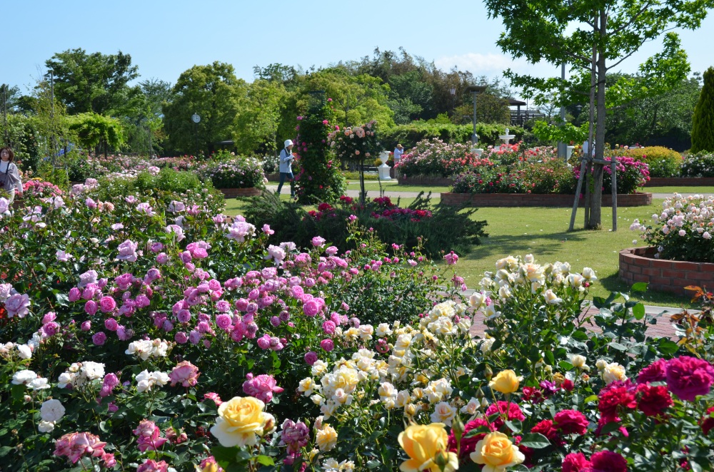 町の花「バラ」を約300品種・約3,300株植栽してあります。テーマごとに花壇を設置し、それぞれ違った香りや花の形を楽しむことができます。芝生広場には大型遊具が設置され、ご家族で楽しむことができます。