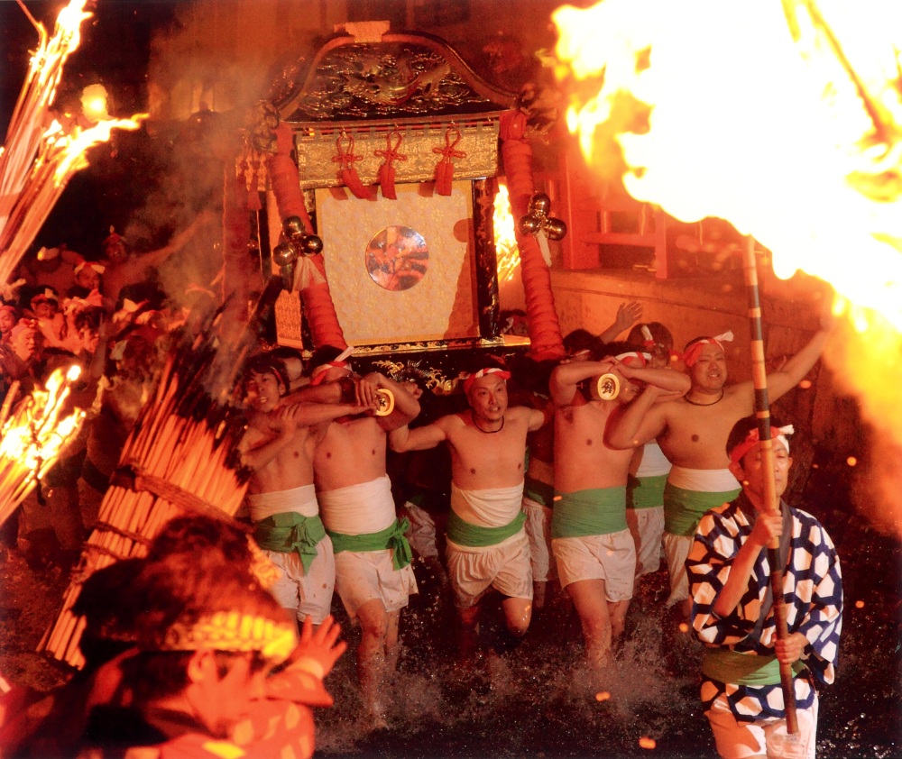 国内でもまれな勇壮かつ豪快な火まつりとして知られ、本楽祭の午前0時、若い衆に担がれた神輿が松明の灯に映えながら450mほど参道を疾走する様はまさに圧巻です。