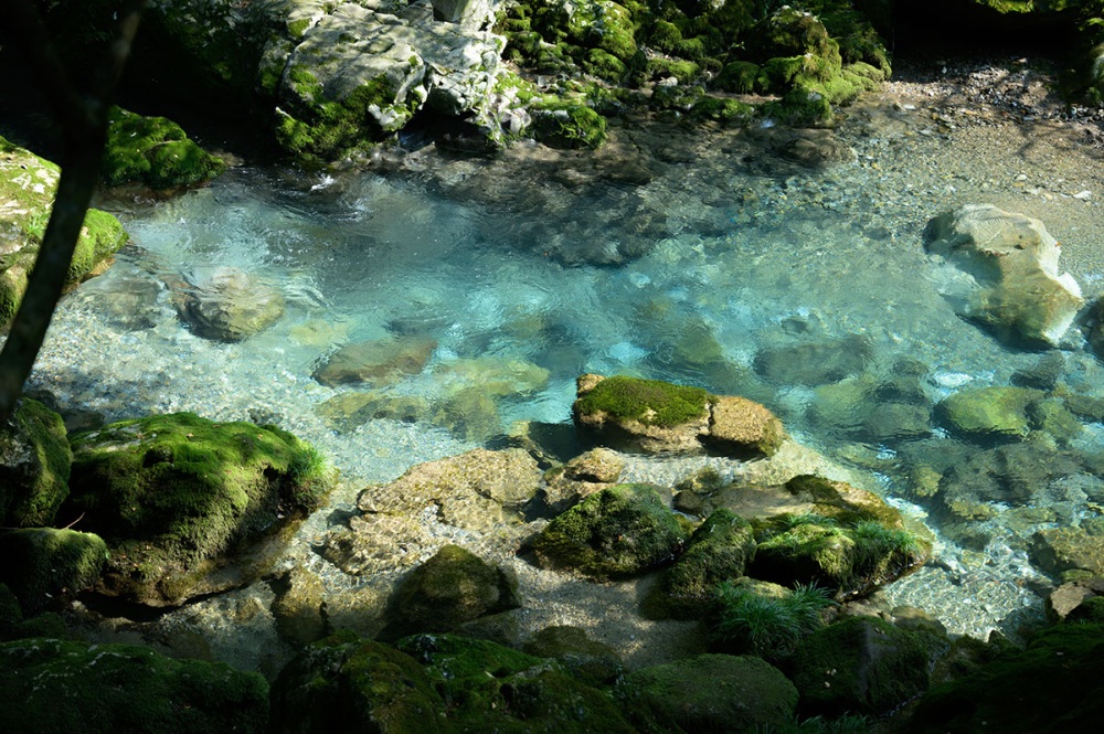 山県市の北部を流れる約8キロほどの円原川。神崎川に合流したのち武儀川となり、最終的には長良川に注ぎます。透き通る水と岩に張り付く苔のきれいな川は「ぎぶ水と緑の環境百選」にも選ばれており、まさに清流長良川となる源流の一つです。