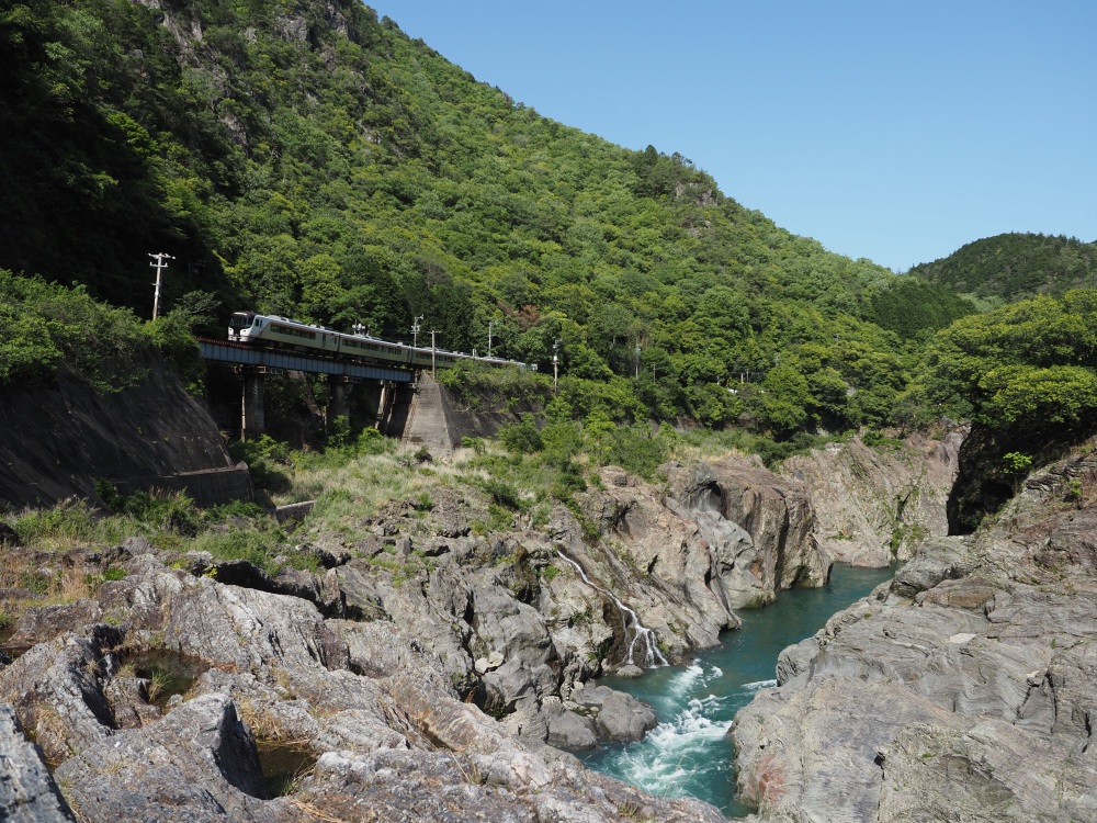 6月ごろには岩場に赤い岩ツツジが咲き鮮やかな色どりを加えます。また、周辺には国の天然記念物である「飛水峡の甌穴群」があり、長い年月をかけて川が岩を削り作り出した不思議な地形を間近でみることもできます。