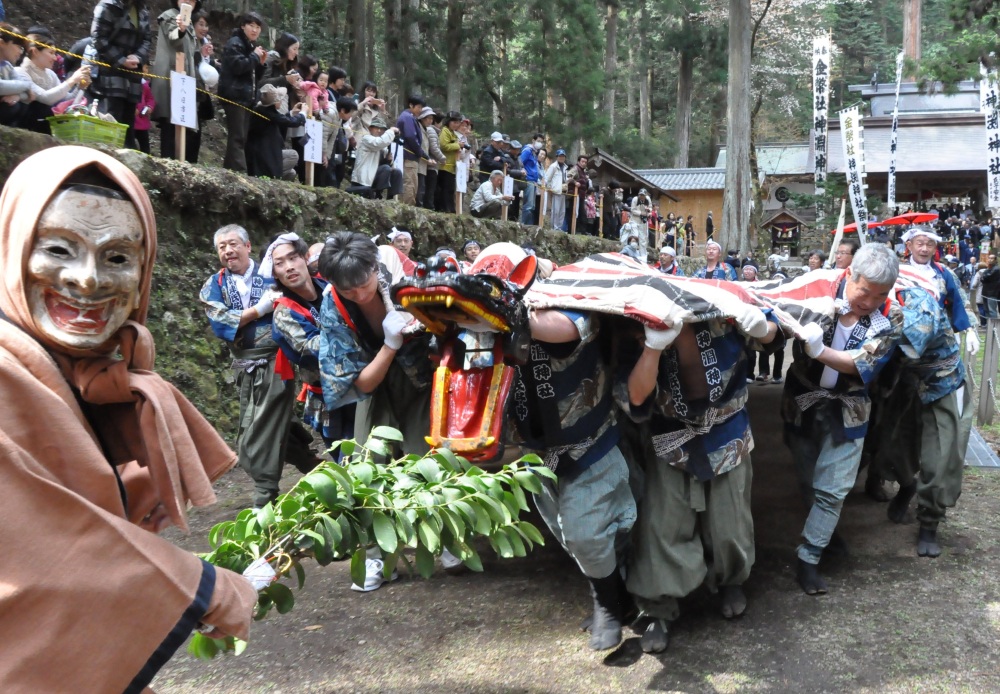 神渕神社例大祭は天照大神の弟といわれている須佐之男命の大蛇退治に由来し、約420年の歴史があります。地域の方々が地区ごとに交代制で運営を担当し、長年にわたり大切に受け継がれてきた行事です。全長10mもある黒獅子や、おかめと天狗による独特な振る舞いも必見です。