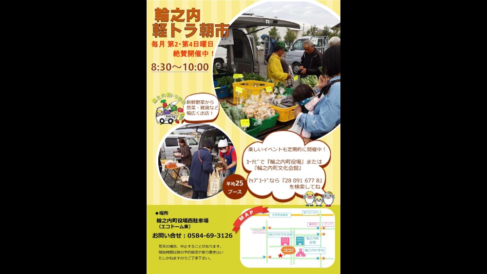 新鮮でお値打ちな野菜を中心にたくさんのお店が自慢の商品を軽トラに積んで出店します。また、お菓子の詰め放題や豚汁の無料配布等のビックイベントも年に数回行われており、「見て楽しい、買ってうれしい」朝市です。