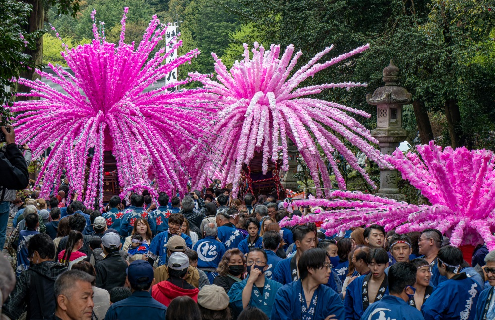 「花みこし」「山車・練り物」「流し仁輪加」の3部からなる八幡神社の祭礼。地元の町内ごとに桜色に染めた美濃和紙を”しない”と呼ばれる竹に巻き、みこしの上に取り付けます。大小合わせて30基ほどの花みこしが町を練り歩く姿は圧巻です。