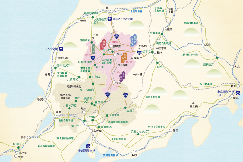 ・高山ー白川郷:中部縦貫自動車道・東海北陸自動車道で約50分