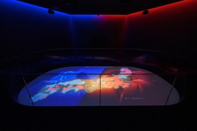 全国の大名を巻き込んだ合戦の全貌を床面スクリーンで俯瞰できます。東西陣営がどのような戦略で戦ったのかが一目瞭然です。
