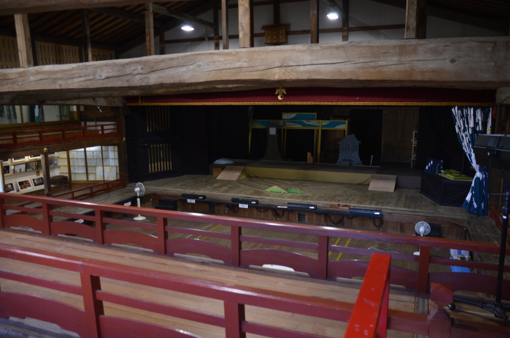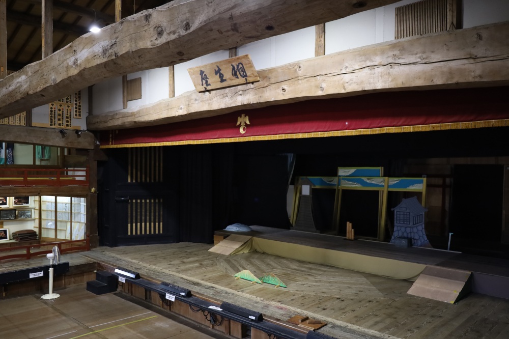 相生座の芝居小屋には回り舞台、両花道があり、客席は1階の平土間と2階の特等席、桟敷があります。本格的な歌舞伎の舞台。舞台の床には、明治時代から使われている板が残り、そこだけ違う色をして年月の長さを物語っています。