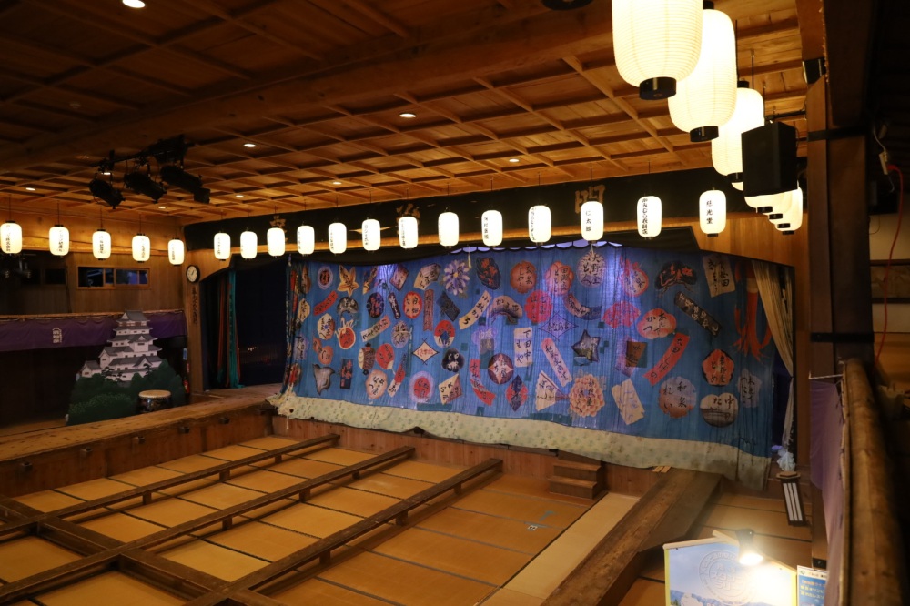 村人の手作りとはいえ、本格的な廻り舞台やすっぽん、両花道や2階席まである、劇場形式の豪華な農村舞台。屋号と名前が鮮やかに染められた「娘引き幕」も見事です。舞台裏の控室には明治時代の旅役者が書き残した落書きが残り、名誉館主・中村七之助氏のサインも見られます。