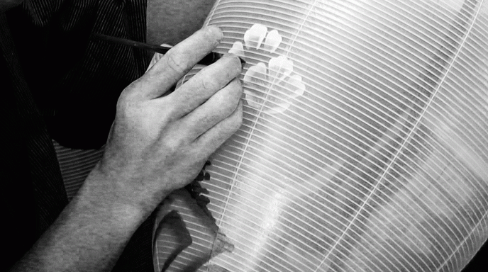 絵柄を描くのは、和紙をひごに張り付ける前に、型紙を使って色を摺(す)り込む技法と、無地の火袋に手描きする技法の二つ。ひごの凹凸や、光を灯したときの透け具合などを考えながら、同じ絵柄をいくつもの提灯に描いていくのは、相当な技術が必要です。