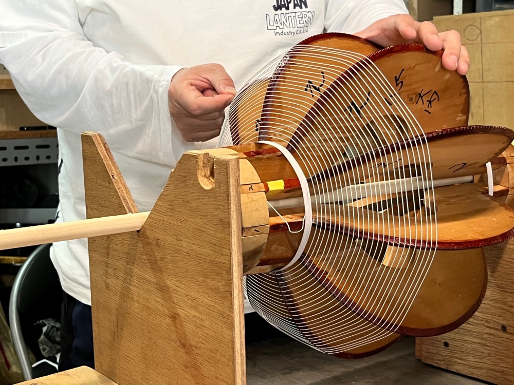 提灯づくりは、細かな作業の連続です。細かい溝に沿って、細いひごを均等にらせん状に巻いていき、巻き終えると全体にのりを付け、薄い和紙を張ります。形を整えたら、火袋の完成。
