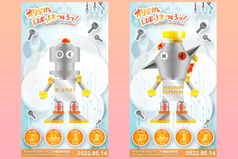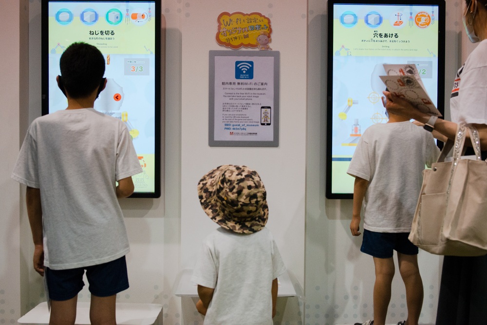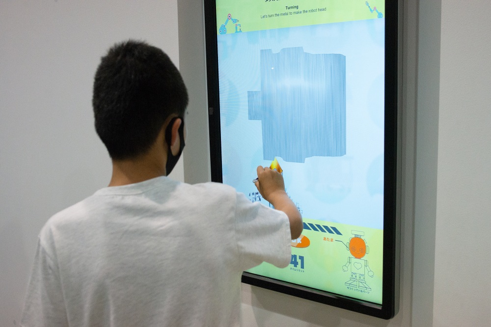 大画面のタッチスクリーンで、ゲーム感覚で鉄を加工してロボットを作っていきます。皆さんのスマホを館内のWi-Fiにつなげておけば、 最後には自分が作ったロボット画像をダウンロードできますよ。