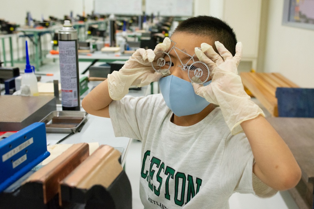 モノづくり体験をする部屋は広く、作業テーブルがいくつも並んでいます。その作業テーブルの上には数種類の工具が綺麗にセットしてあり、無意識のうちに製作意欲が湧いてきました。教えてくれる先生は金属加工のスペシャリストで、優しく教えてくれましたよ。出来上がる作品は本格的な質感で子供たちも大満足!