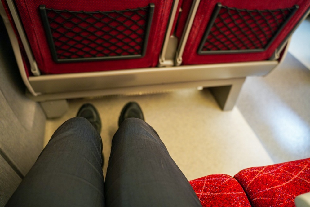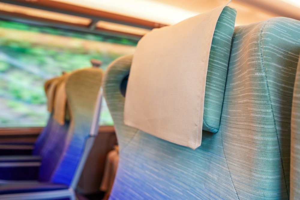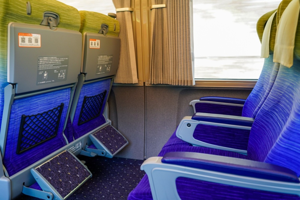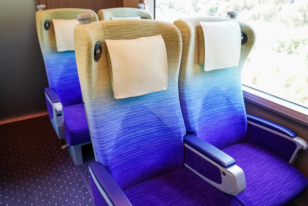 次はグリーン車のご紹介です。普通車の乗り心地でも充分満足できましたが、グリーン車はより一層過ごしやすい空間になっていました。先程の普通車のオレンジとは印象がカラッと変わり、美しい青色の座席はより広々とした快適な乗り心地です。