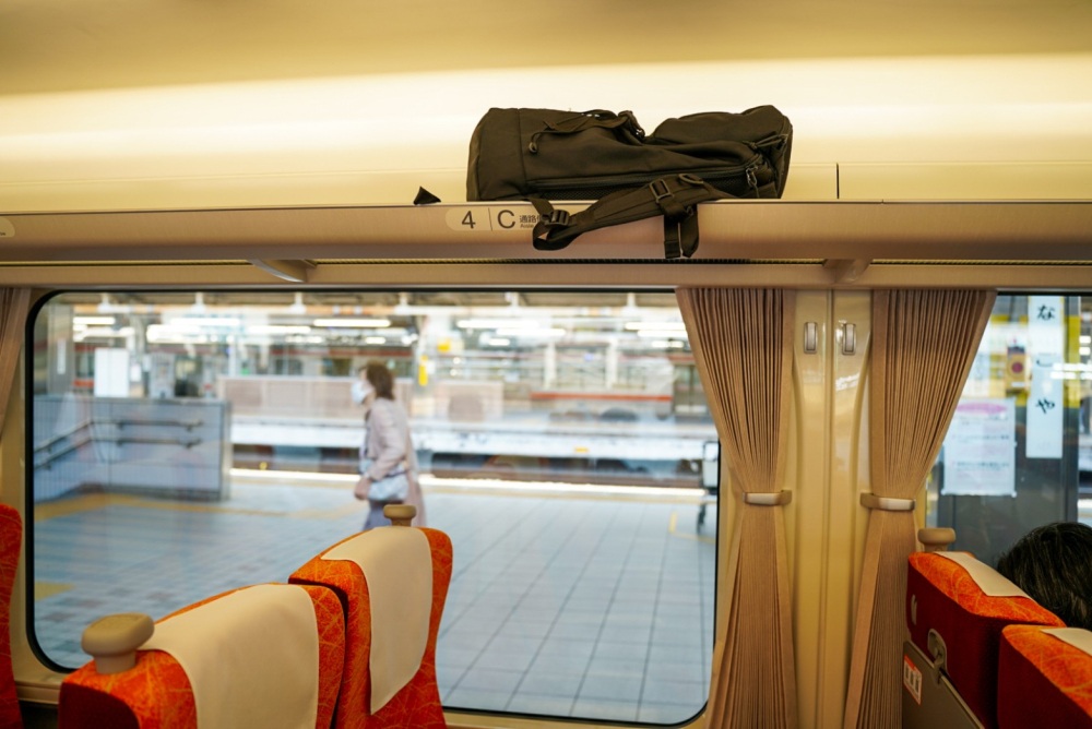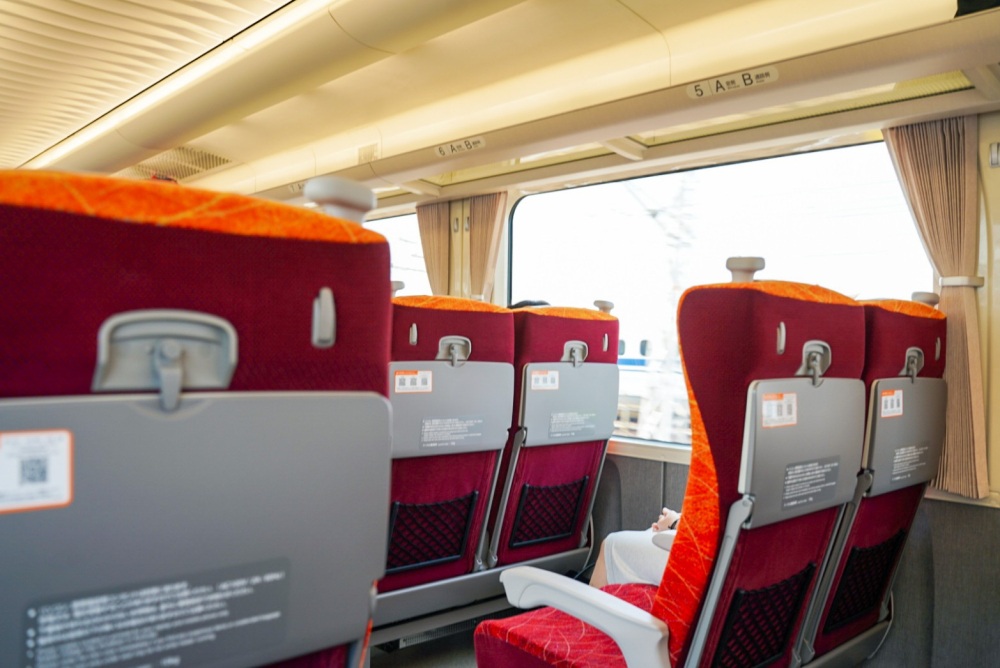 今回乗車する普通車の車内に入ると、美しく鮮やかなオレンジ色の座席が、明るい雰囲気を作り出していました。ゆったり広々と座れるので、高山までゆっくり余裕を持って過ごせました。そして、それぞれの座席にコンセントがついており、肘置きの下にあるため扱いやすく、スマートフォンの充電やパソコンの作業もしやすい環境です。荷物は座席の上にある大きな荷棚に置けるので、席周りはスッキリとした状態で過ごすことができました。