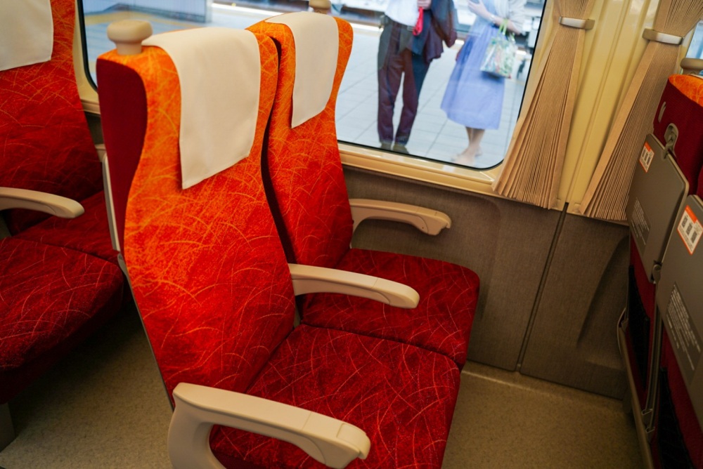 普通車とグリーン車の座席を体感してきましたが、まず印象的だったのは座席の色。グリーン車は沿線の新緑や美しい川、夕暮れの紫の空をグラデーションで表現した“落ち着いた上質感”のある座席であり、普通車は沿線の紅葉、祭り、花火をグラデーションで表現した鮮やかな“明るいワクワク感”をテーマにしているそうです。この座席はとても美しい印象を覚えました。