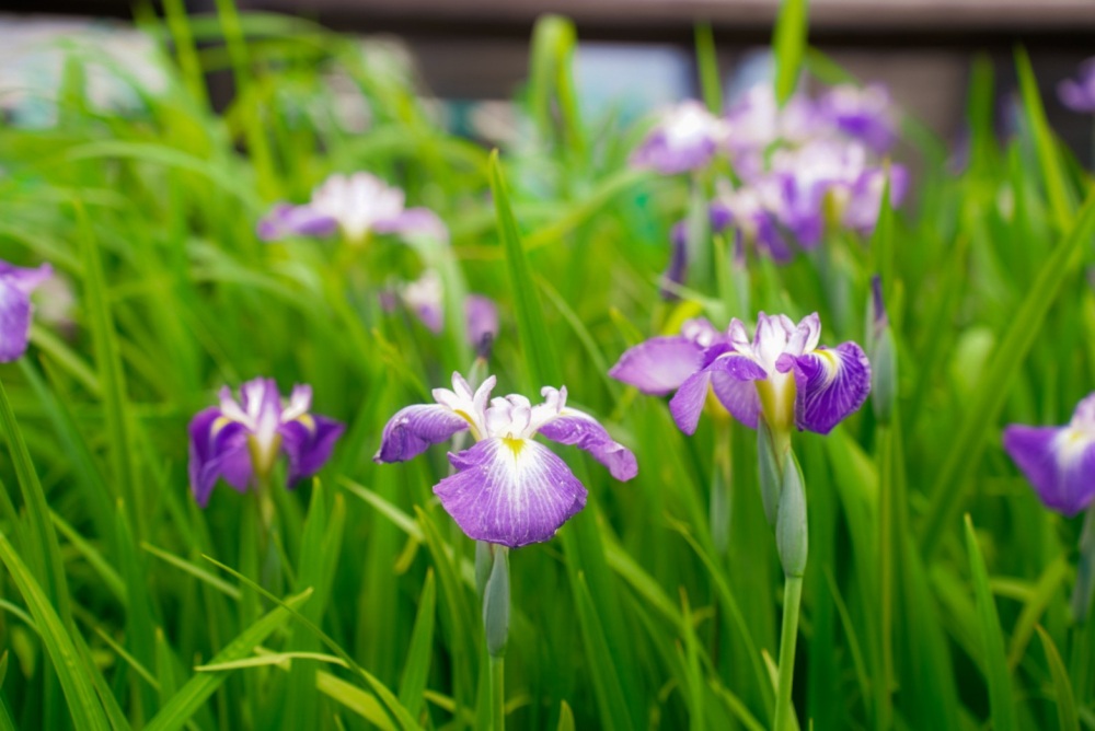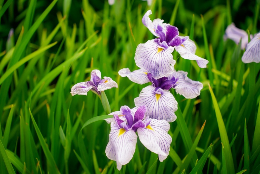 色とりどりの花菖蒲は、シャープなフォルムが凛としていて美しいです。初夏の晴れ渡った青空と撮影すると、空のブルーと葉のグリーン、それぞれの花びらのカラーのコントラストが、とても美しく映えました。