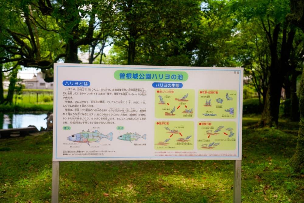 曽根城公園では、ハリヨという珍しい小型淡水魚を見ることができます。ハリヨは、岐阜県西南濃、滋賀県の東部、三重県の北部のごく限られた一部でしか見ることができません。以前に曽根の池に、ブラックバス等が侵入してしまい、ハリヨが絶滅状態になったことから、ハリヨ池を整備しこの曽根城公園で守られています。