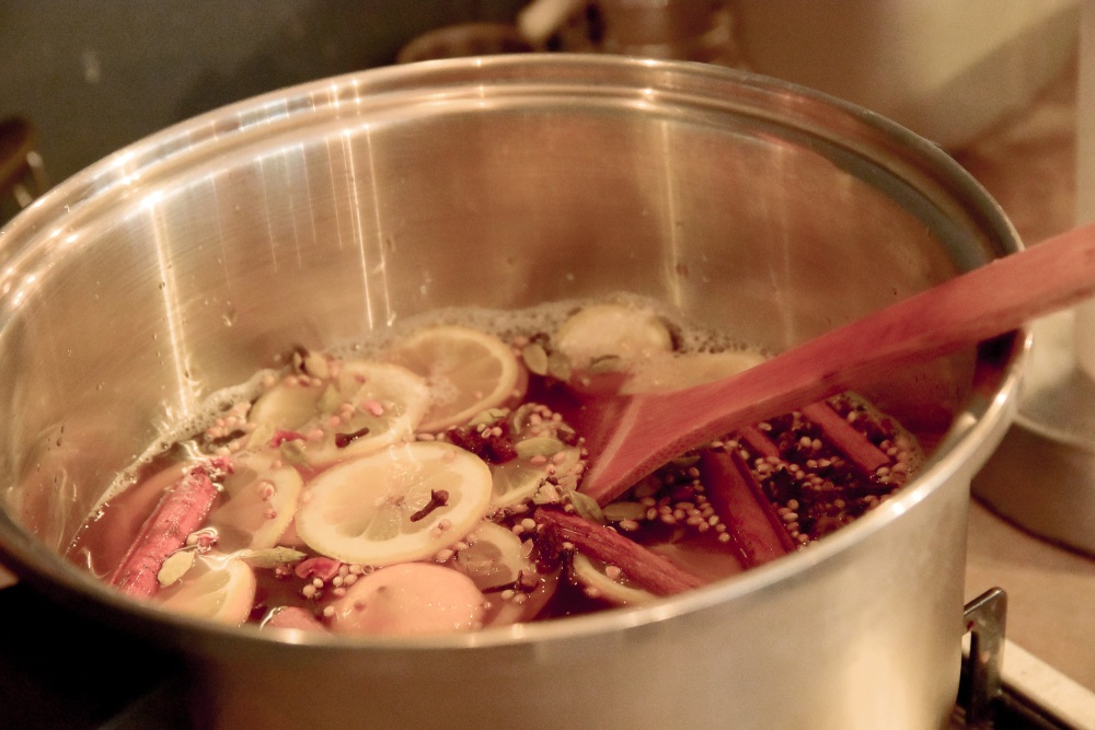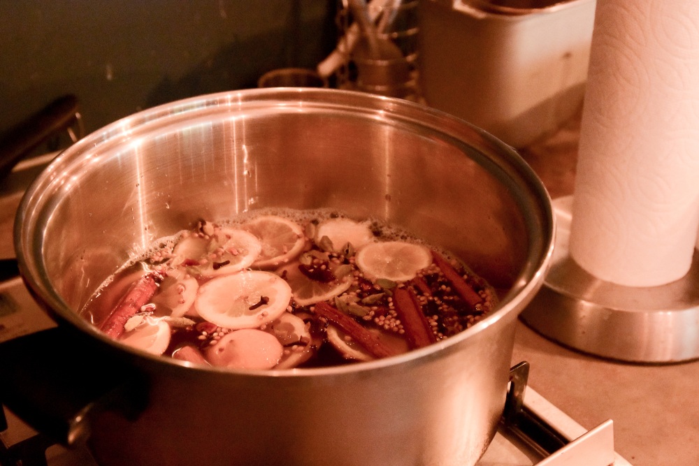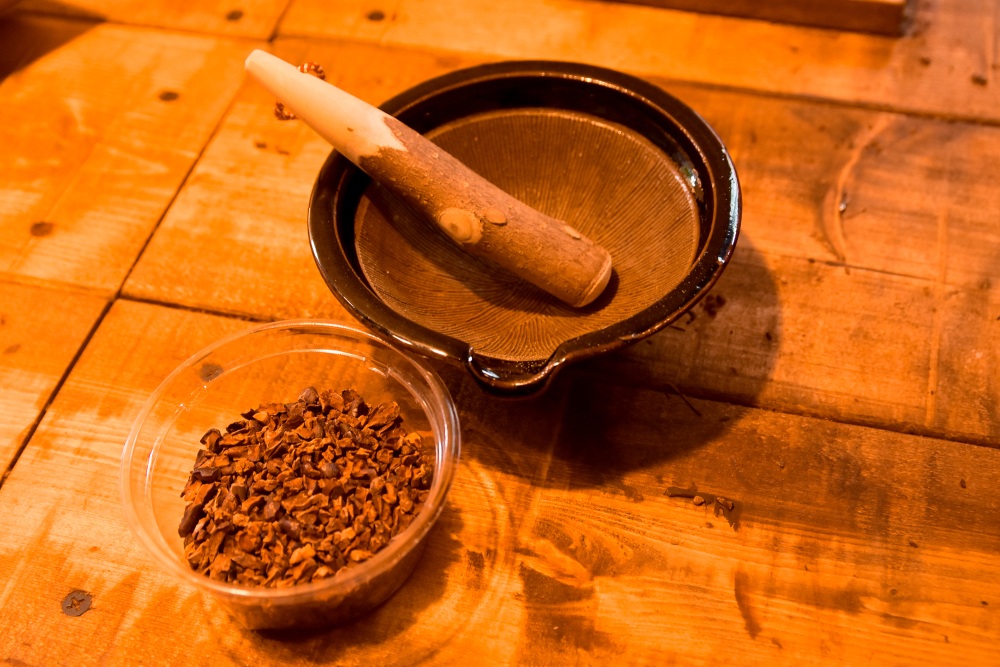 店を訪れると、ちょうどニブクラフトコーラを作っていらっしゃる最中でした。スターアニス、ナツメグ、カルダモン、コリアンダ、クローブ、シナモンを砕き、水、てんさい糖、はちみつ、レモンのスライスを入れてまずはひと煮立ち。30分ほどしてからさらにレモンをプラスし一旦落ち着かせていました。冷え切る前に、香ばしく焙煎されたカカオをすり鉢ですりつぶしたニブをプラスすると、ふんわりとカカオの香りがプラスされ、店中がいい香りに包まれていました。