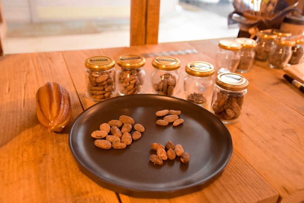 世界中から厳選した豆を仕入れ、お店で焙煎し、石臼で24時間以上すりつぶしてチョコレートを作っていらっしゃるお店で、店頭にはホンジュラス、インド、グラテマラなど世界のいろんな国で作られたカカオ豆が並んでいます。産地ごとに分けたカカオ豆ときび糖のみで作られるシングルチョコレートは、一般的なチョコレートは一線を画す味です。